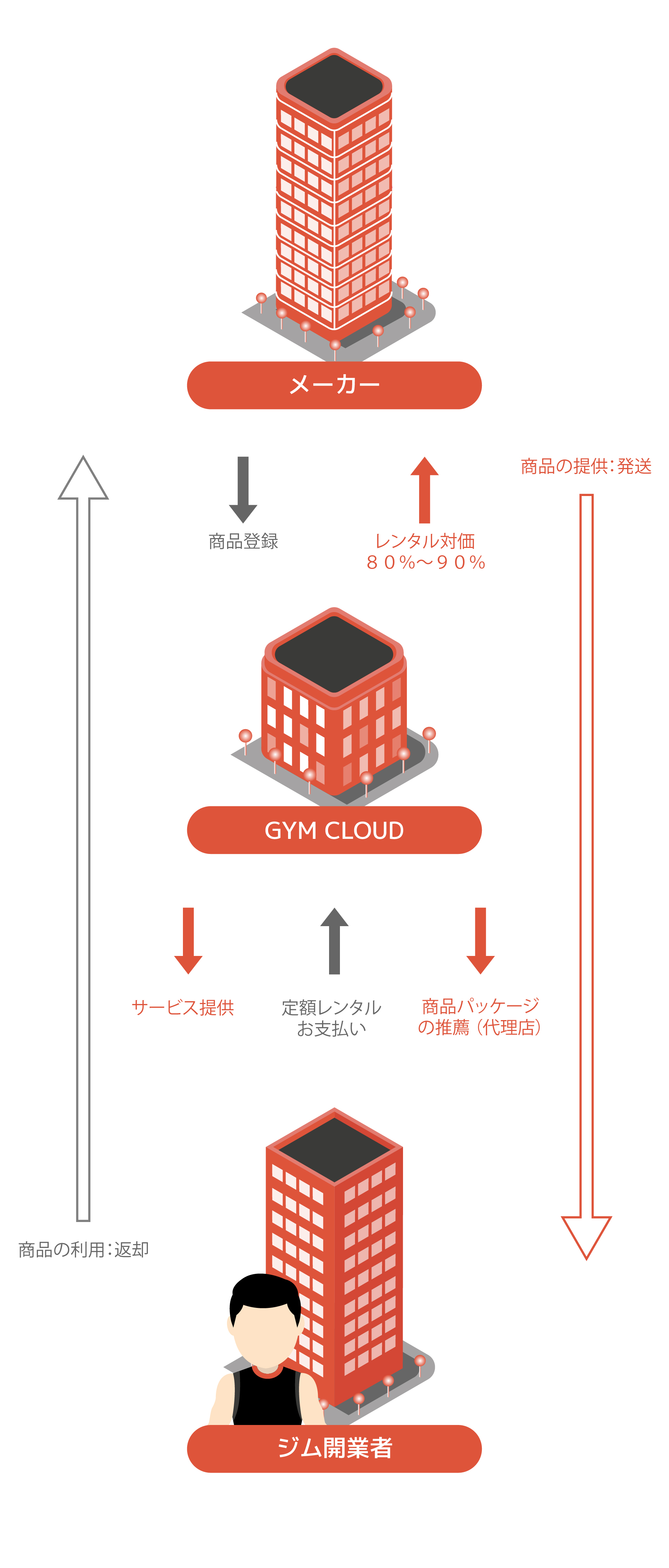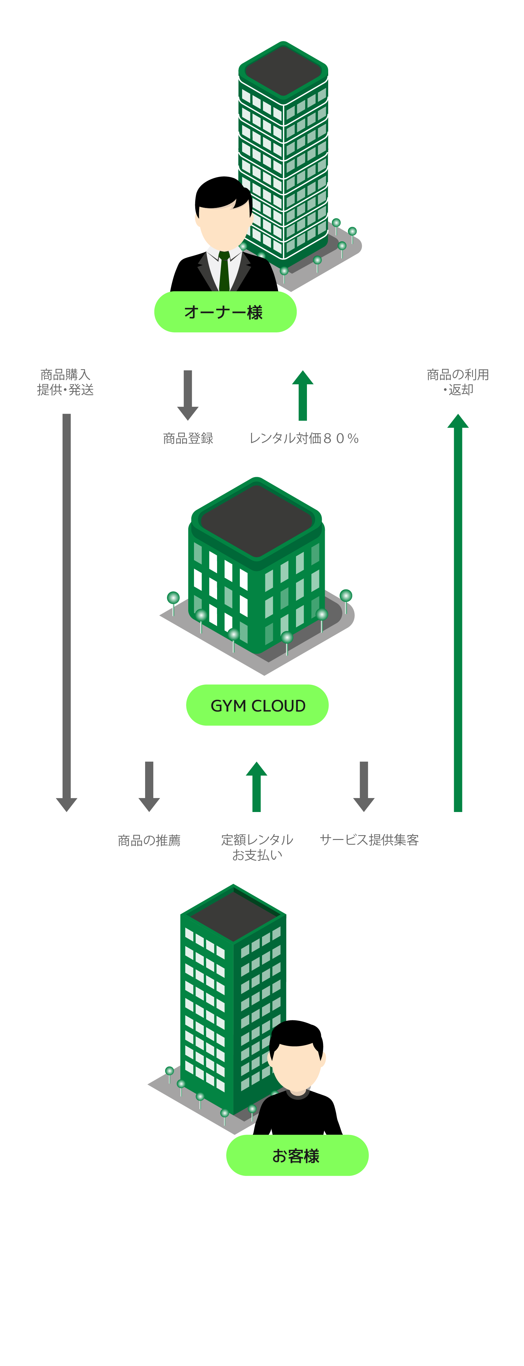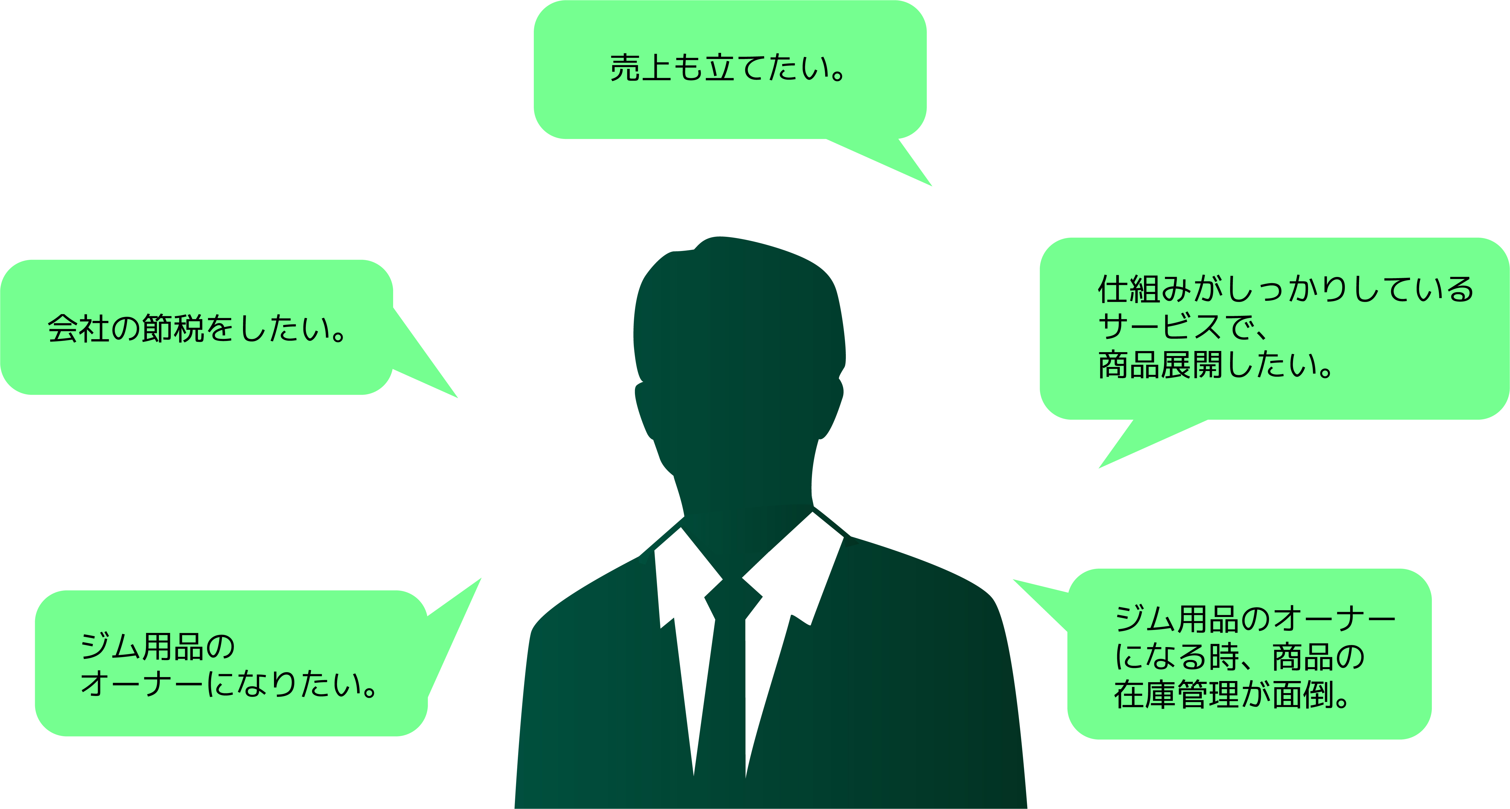 会社の資産・個人の資産として、ジム用品を購入し、その商品のオーナーとして、サブスクで展開することで、税金対策・継続的な収益の確保が可能。まとまった金銭が必要になった場合は、GYM CLOUDのページ内に併設予定のジムクラウド アウトレットにて、売価を決めて、売却することも可能です。